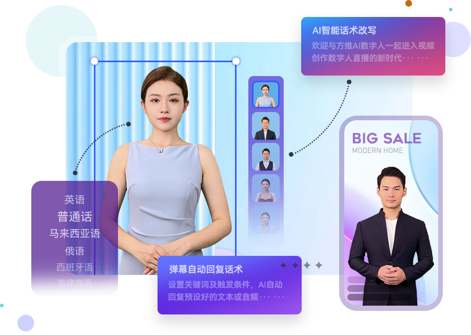 AI數(shù)字人定制 / 數(shù)字人直播 / AI短視頻生產 / AI語音合成 / 場景化模板 / 智能腳本